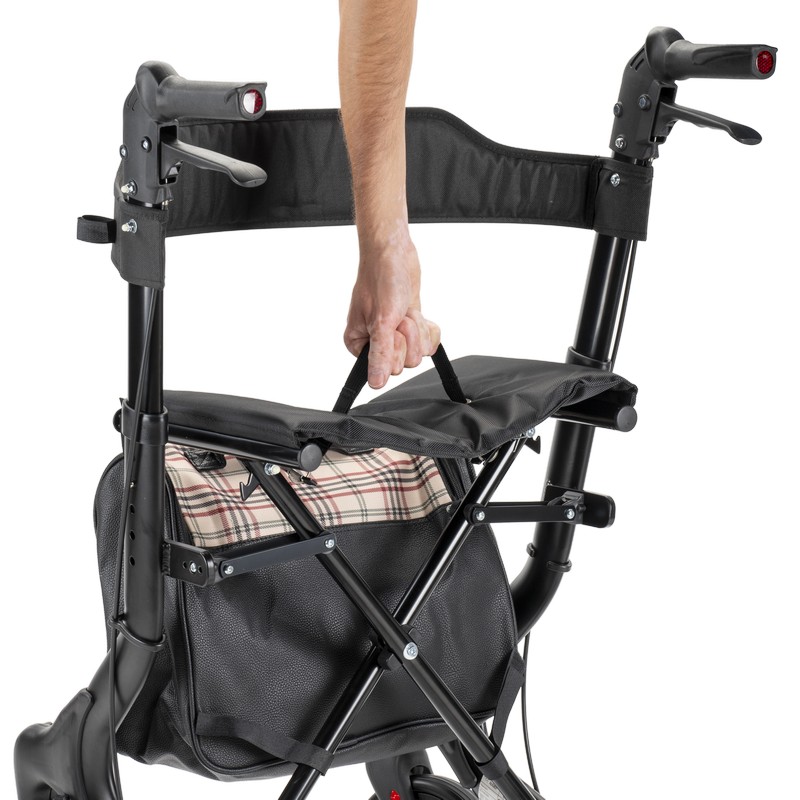 De Ease rollator biedt ultiem comfort met een gewatteerde zitting, ergonomische handvatten en een unieke skai leren tas.