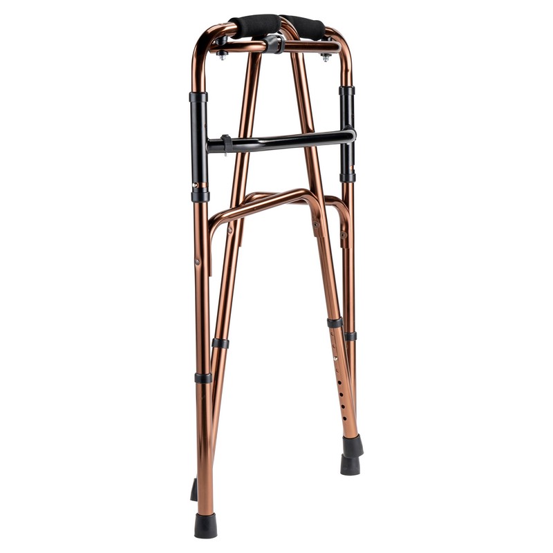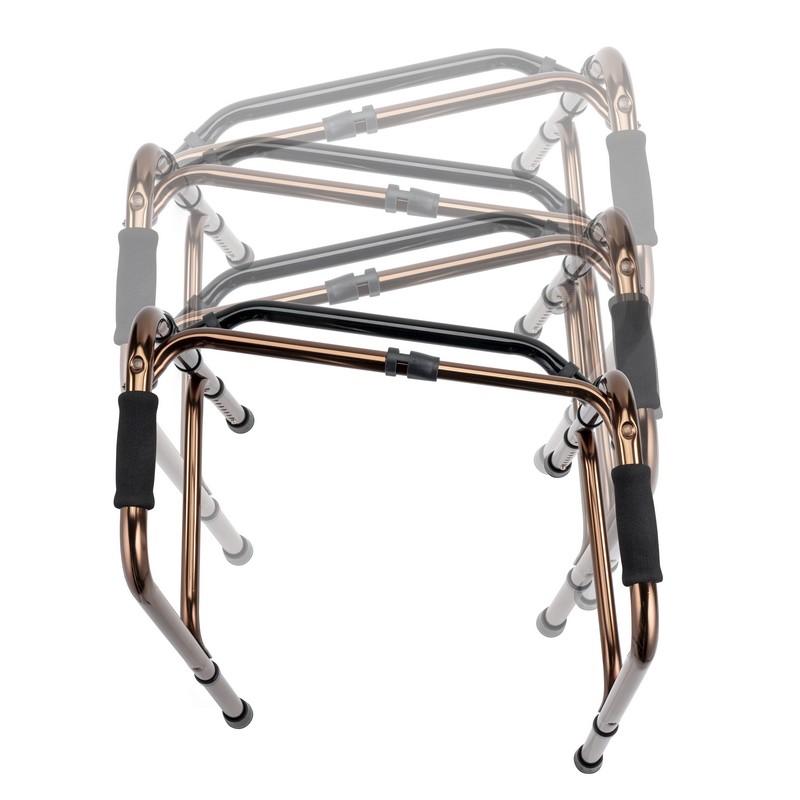 Dit lichtgewicht aluminium looprek is eenvoudig inklapbaar en verstelbaar in 8 hoogtestanden (75–93 cm). De bronze kleur geeft het een luxe uitstraling. Dankzij de ‘loopfunctie’ beweegt het looprek met de gebruiker mee voor een natuurlijke loopbeweging. Deze functie is ook uit te schakelen met de meegeleverde clips.