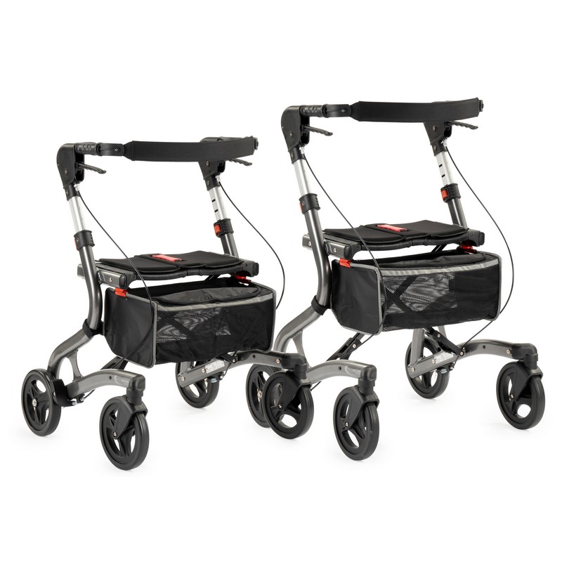 Ergonomische en stabiele rollator met PU-banden, comfortabele zitting en afsluitbare tas. Verkrijgbaar in twee zithoogtes.